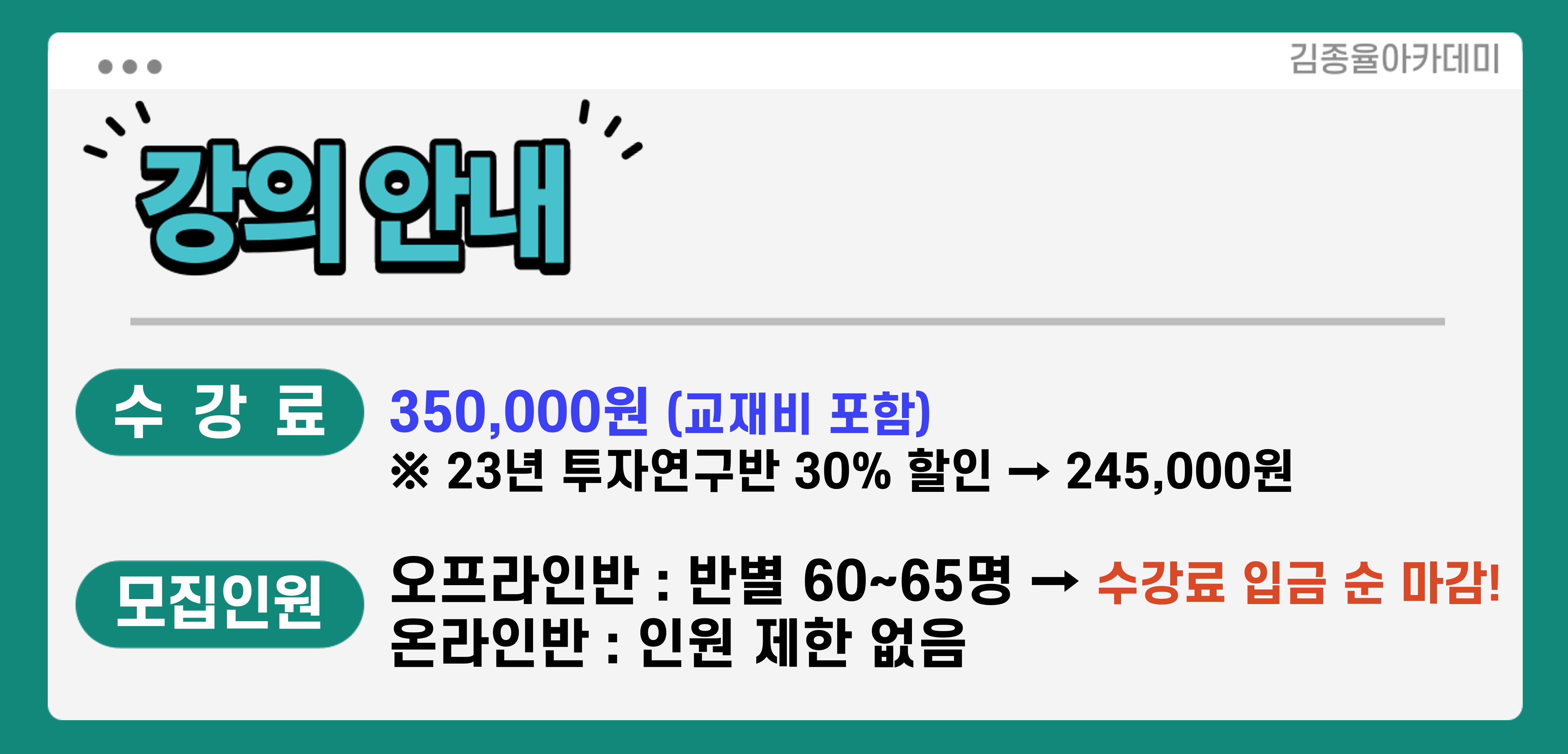 ★ 2023년 하반기 투자연구반 30% 할인 미적용인 분들은 카카오톡 채널로 연락주세요.
